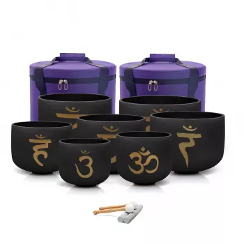 Double Black Chakra Design Frosted Quartz Crystal Singing Bowl Set